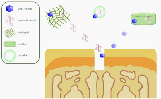 Scaffold-guided gene transfer for the goal of cartilage repair (Figure 3) has been attempted using hydrogels and polymeric micellar systems which are able to condense DNA by forming a polyplex micelle through polyion complex formation [99,100], similarly to poloxamer PF68 and poloxamine T908 polymeric micelles, alginate-, self-assembling RAD16-I peptides- or polypseudorotaxane gels [101], and PU scaffolds carrying rAAV vectors [102]. Such systems were employed to overexpress TGF-β [103], an interleukin-1(IL-1) receptor antagonist (IL-1Ra), and SOX9 [102,103] as a means to safely target human MSCs (hMSCs) [102,103] and enhance their potential for chondrogenesis and immunomodulation [103], applied to experimental models of cartilage defects in situ for biological joint resurfacing. Moreover, mechanical loading of these structures showed to be an advantageous strategy to promote the formation of an ECM cartilage-like tissue [102].