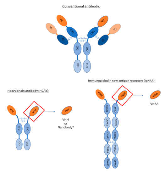 Schematic representation of conventional antibody versus heavy-chain antibody found in Camelidae versus immunoglobulin new antigen receptor found in sharks. VHH is the variable domain of heavy-chain IgG2 and IgG3. The difference between these two IgG is the length of the hinge (region between VHH and CH2). VNAR is the variable domain of IgNAR.