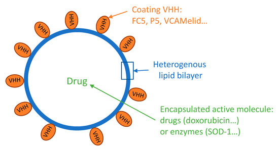 Encapsulated active molecule (drug or enzyme) into VHH-coated liposomes for brain delivery.