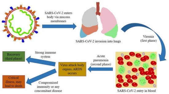 The average time period, from onset of symptoms to acute respiratory distress syndrome (ARDS), is ~8 days. If the patient’s immune system is effective in the second phase and there is no concomitant disease, the virus can be suppressed efficiently, and the individual can recover (Figure 1). If an infected individual is older, in an immunocompromised condition or experiencing any concomitant condition, then the virus might attack again, leading to aggravated symptoms within 7–14 days after onset []. Various potential risk factors for the severity of infection may include obesity, host genetics, pregnancy, smoking and many more. However, there is still limited data available about other factors that might be reasons for the variation of the severity of the disease [,]. Reports suggested host innate immune response as higher neutrophil, C-reactive protein, interleukin-6 (IL-6) and reduced lymphocyte counts were observed in infected individuals. Neutrophilia and lymphocytopenia resulted in increased disease severity [,,].