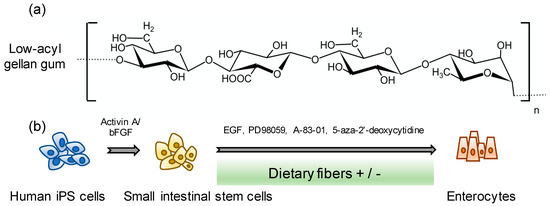 Scheme of human induced pluripotent stem (iPS) cell-derived enterocyte differentiation. (a) Structure of low-acyl gellan gum. (b) Human iPS cell-derived enterocyte differentiation method.