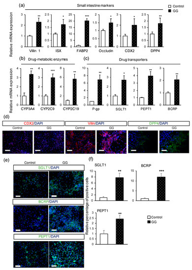 The effect of GG on the differentiation of human iPS cells into enterocytes. (a–c) Relative gene expression levels of small intestinal markers, drug-metabolizing enzymes, and drug transporter markers. (d) Immunofluorescence images of the small intestinal marker caudal-type homeobox 2 (CDX2) and enterocyte markers villin and dipeptidyl peptidase-4 (DPP4). (e) Immunofluorescence images of the drug transporter markers sodium-glucose co-transporter 1 (SGLT1), breast cancer resistant protein (BCRP), and peptide transporter 1 (PEPT1). (f) Relative percentage of positive cells of drug transporters. Scale bars = 100 μm. All data are presented as mean ± S.D. (n = 3). Control = 1. Levels of statistical significance: * p < 0.05, ** p < 0.01, *** p < 0.001.