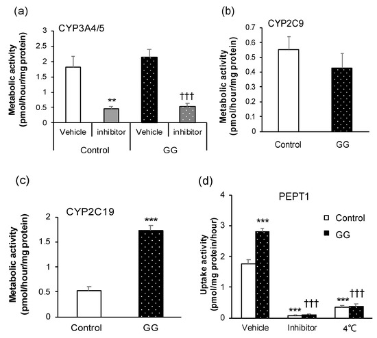 Pharmacokinetic functions in the differentiated enterocytes. (a) Cytochrome P450 (CYP) 3A4/5 activity in the presence or absence of 10 μM ketoconazole, a CYP3A4 inhibitor. (b,c) CYP2C9 and CYP2C19 activities. (d) Uptake activity via peptide transporter 1 (PEPT1). Ibuprofen was used as an inhibitor of PEPT1. All data are presented as mean ± S.D. (n = 4). Levels of statistical significance compared with the control group (vehicle): ** p < 0.01, *** p < 0.001. Levels of statistical significance compared with the GG group (vehicle): ††† p < 0.001.