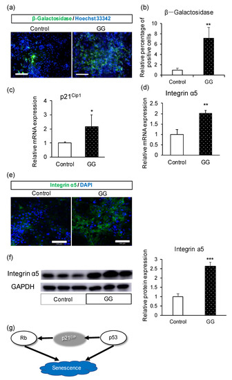 Previous studies have shown that vascular smooth muscle cells (SMCs) can survive with higher viability in a suspension culture with GG. GG can arrest vascular smooth muscle cell growth by inhibiting their entry into the cell cycle via the induction of p27Kip1 [32]. However, p21Cip1 expression was reduced in the presence of GG, although the level of p21Cip1 was higher in our study. p21Cip1 is not only an apoptosis-related protein but also a senescence trigger [34,45]. We hypothesized that the increase in the number of senescent cells was due to an increase in p21Cip1. The differences in cell types may have caused the inconsistent results. Additionally, in the previous study, GG played the role of a scaffolding substrate by virtue of its viscosity. However, in our study, the medium with GG showed almost no viscosity. This may be another reason for the different results.