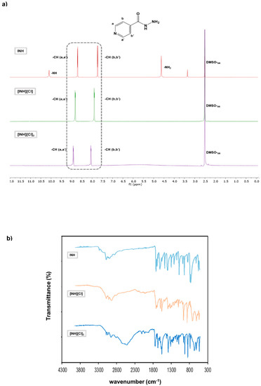 Characterization of mono and diprotonation of INH with counterion chloride. (a) 1H-NMR spectra of INH (top), [INH][Cl] (middle) and [INH][Cl]2. (b) FTIR-ATR spectra of INH (top), [INH][Cl] (middle) and [INH][Cl]2.