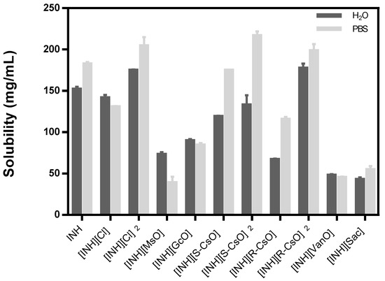Solubility of isoniazid and organic salts prepared with isoniazid in water and PBS, the results are represented as mean ± standard deviation.
