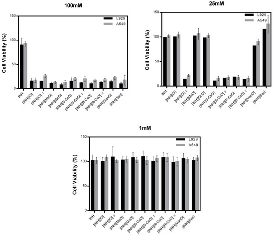 The cytotoxicity assay was performed in accordance with ISO/EN 10993 guidelines, in which the cells were seeded onto a 96-well plate (1 × 105 cells/mL in L929 cells and 2 × 105 cells/mL in A549 cells) and after 24 h of attachment, the medium were removed and the cells were incubated with 100 μL of extracts with 100 mM, 25 mM, and 1 mM concentration of organic salts and isoniazid, during 20–24 h. After the incubation time, the cells were washed with PBS and 100 μL of MTS (3-(4,5-dimethylthiazol-2-yl)-5-(3-carboxymethoxyphenyl)-2-(4-sulfophenyl)-2H-tetrazolium)) media were added at each well, in a dilution of 1:10. Then they were incubated for 3–4 h, at 37 °C with 5% of CO2 atmosphere. The amount of formazan product was measured in a microplate reader at 490 nm. The data were expressed in percentage of cell viability with the control and the experiments.