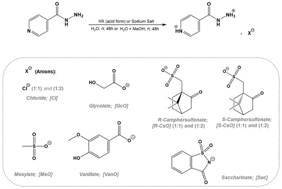Isonicotinic acid hydrazide (CAS no. 54-85-3, 98% purity) was purchased from Alfa Aesar (Kandel, Germany) and was used as a cation for combination with the organic anions. The reagents used were commercially available and were purchased from Alfa Aesar and Sigma Aldrich (St. Louis, MO, USA). The organic salts prepared in this work were isoniazid chloride [INH][Cl] in the ratio 1:1 and 1:2, isoniazid mesylate [INH][MsO], isoniazid glycolate [INH][GcO], isoniazid camphorsulfonate S and R [INH][S-CsO] and [INH][R-CsO] in the ratio 1:1 and 1:2, isoniazid vanillate [INH][VanO], and isoniazid saccharinate [INH][Sac].