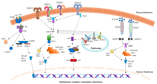 The breach of the host immune system by pathogenic microorganisms generates an array of immune reactions through the synergy between the diversified cluster of pathogen-based virulence factors and defensive immune processes of the host. The host–pathogen encounter usually launches immune reactions via identification of conserved molecular structures known as pathogen-associated molecular patterns (PAMPs) [6]. Active recognition of a PAMP immediately elicits an immune response in the host by stimulating multiplex signaling pathways that climax in the inflammatory responses regulated by numerous chemokines and cytokines, which consequently promote the elimination of the harmful microorganism carrying the PAMP, such as viral double-stranded ribonucleic acid (RNA) and lipopolysaccharides (LPS) [7,8,9]. Moreover, the innate immune system expands efficient defense against pathogenic microbes by initiating adaptive immunity, which involves immunological memory and is long-lasting. Adaptive immunity is characterized by the formation of antigen-specific T and B lymphocytes via gene rearrangement [10].