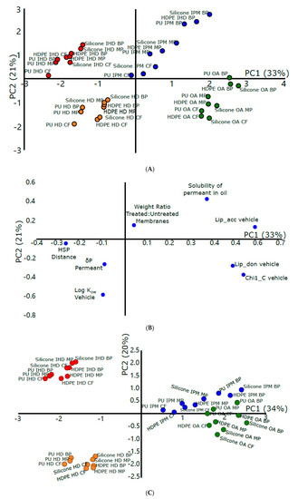 An examination of the model for solvent uptake shows that the first two PCs in this experiment describe 77% of the total variance in the data (Figure 2). The molecular descriptors δDm and δTm were removed from the analysis because the initial results showed them to be so different to the other descriptors that they skewed the analysis. This was not surprising, since only a limited number of membranes (three) with vastly different solubility parameters were under study. However, despite δDm and δTm not loading heavily on either PC1 or PC2, these were the only parameters in the initial descriptor set that represented the properties of the membrane. If this study is to be robust, membrane descriptors should not be excluded, and so an alternative was needed. To this end, the distance between the Hansen Solubility Parameter (HSP) values of the membranes and vehicles, was introduced. This derived parameter represents a measure of the degree of matching (i.e., similarity) between the solubility parameters of the vehicles and the membranes [28]. The lower the HSP distance value, the more alike the polymer (membrane) and solvent (oily vehicle). Therefore, the vehicle that has similar partial components to the partial components of the membrane might be expected to induce the greatest swelling of the membrane, consequently modifying the partitioning and diffusion of permeants through the membrane. Therefore, HSP distance represents a descriptor relating the vehicle to the membrane (i.e., a vehicle–membrane interaction term). HSP distance was shown by PCA to be significant in its contribution to explaining the variance of the data with respect to solvent uptake.
