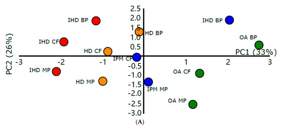 (A) Scores plot from the PCA of solvent uptake of oily vehicles into synthetic membranes showing clear groupings with respect to different vehicles (isohexadecane (IHD) in red, hexadecane (HD) in orange, oleic acid (OA) in green and isopropylmyristate (IPM) in blue). The first two principal components (PCs) explain 77% of the total variance in the dataset; 46% and 31% of the variability are explained by PC1 and PC2, respectively. (B) Loading plots from the PCA of the solvent uptake of oily vehicles into synthetic membranes showing descriptors, primarily related to describing the physicochemical properties of the vehicle, being highly loaded on PCs 1 and 2 and hence being most responsible for explaining the variation in solvent uptake observed.