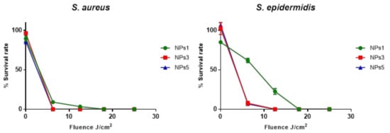 The use of high fluence rates of the exciting light can cause oxygen depletion and PS photobleaching. Therefore, low fluence rate is more clinically relevant. To observe the influence of light dose on the survival rate of bacteria, S. aureus and S. epidermidis were directly put in contact with the most active NPs (NPs 1, 3 and 5) in PBS (Figure 1). After an incubation period of 4 h in the dark in the different solutions, the washed bacteria were irradiated by the same device used previously. Bacterial concentration and survival rate were monitored following the increasing light dose. For each strain, three independent experiments were performed.