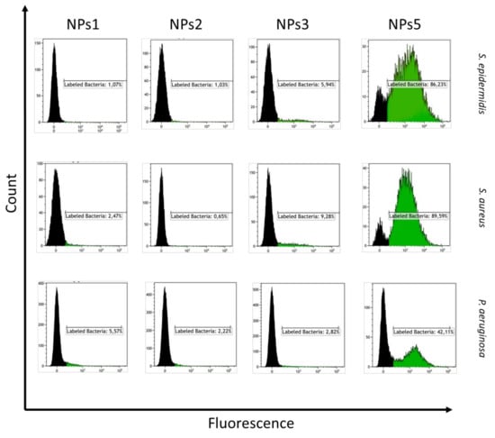 Flow cytometry analyses. Cytofluorometric profiles representing the distribution of bacterial cells labeled with NPs.