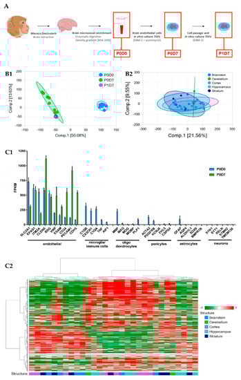 Brain endothelium transcriptome of samples prepared from non-human primates (NHP). (A) Diagram of the procedure conducted for the isolation of NHP-derived brain microvessels and in vitro selection of brain endothelial cells (BECs). (B1) Principal Component Analysis (PCA) of brain cortical microvascular samples clustered in 3 groups (P0D0 n = 8, P0D7 n = 8, P1D7 n = 6). (B2) PCA of brain endothelial samples clustered in 5 groups (cortex n = 8, brainstem n = 6, hippocampus n = 7, striatum n = 7, cerebellum n = 2). (C1) Comparison of the expression levels of endothelial cell and non-endothelial cell markers in the brain microvascular P0D0 and P0D7 fractions. An expression threshold of one FPKM in at least half of the independent replicates (P0D0, n = 8; P0D7, n = 8; P1D7, n = 6; FPKM ≥ 1 in n ≥ 4 samples) was applied in order to consider only the differentially expressed gene having a significant expression level. Gene levels of brain endothelial cell markers are enriched in P0D0 and P0D7 samples, and even though RNA levels of markers for microglia (or immune cells), oligodendrocytes, pericytes, astrocytes and neurons can be detected in P0D0 samples, their expression is off in P0D7. Results represent average FPKM and are expressed and mean ± SEM. (C2) Hierarchical clustering of BECs from the selected brain structures showing a lack of clustering per brain structure. An expression threshold of one FPKM in at least 3 samples was applied to ECs derived from different regions (cortex n = 8, brainstem n = 6, hippocampus n = 7, striatum n = 7, cerebellum n = 2) for the analysis of differentially expressed genes.