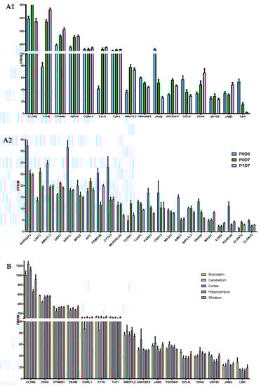 Comparison of the expression levels of several molecular participants in the formation of tight junctions at the brain microvasculature. (A) Gene levels of tight junction elements are globally maintained across P0D0, P0D7 and P1D7 fractions, where (A1) represents the most expressed genes associated with tight junction formation and regulation, and (A2) genes showing lower average FPKM values. Results are expressed as average FPKM and are expressed and mean ± SEM (n = 6–8). (B) Comparison of the expression levels of several molecular participants in the formation of tight junctions in brain microvascular endothelial cells from 5 different brain regions. Results are expressed as average FPKM and are expressed and mean ± SEM (n = 2–8).