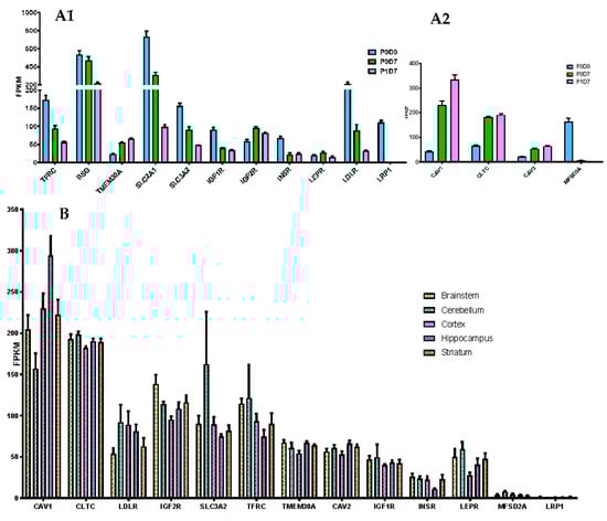 Expression of receptors capable of mediating transcytosis. (A) Comparison of the expression levels (FPKM) of selected receptors (A1) and key internalization pathway genes (A2) present in the brain microvascular P0D0, P0D7 and P1D7 fractions. Results represent average FPKM and are expressed and mean ± SD (n = 6–8). (B) Comparison of the expression levels (FPKM) of selected receptors and key internalization pathway genes present in the brain microvascular endothelial cells from different brain regions. Results represent average FPKM and are expressed and mean ± SEM (n = 2–8).