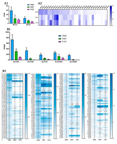 Changes in mRNA levels of ABC and SLC transporters across P0D0, P0D7 and BEC fractions. (A) Comparison of the expression levels (FPKM) between the different ABC transporters present in the brain microvascular P0D0, P0D7 and P1D7 fractions. (A1) ABCB1 and ABCG2 are by far the most expressed ABC transporters across the 3 cell population fractions. Results represent average FPKM and are expressed and mean ± SD (n = 6–8). (B) Comparison of the expression levels (FPKM) between the different SLC transporters present in the brain microvascular P0D0, P0D7 and P1D7 fractions. (B1) SLC2A1, SLC7A5, SLC7A1, SLCO2B1, SLC3A2 and SLC38A5 are the most expressed SLC transporters at P0D0 but are downregulated in vitro. Results represent average FPKM and are expressed and mean ± SD (n = 6–8).
