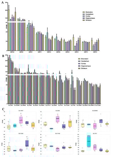 Differences in the mRNA levels of ABC and SLC transporters in the brain endothelium from brainstem, cerebellum, cortex, hippocampus and striatum. (A) Representation of the 10 ABC transporters with highest transcript levels in BECs from across the 5 studies brain regions. Expression levels are represented as average FPKM ± SEM. (B) Representation of the 15 SLC transporters (typically at plasmatic membrane, excludes SLC25A family, mitochondrial transporters) with highest transcript levels in BECs from across the 5 studies brain regions. Expression levels are represented as average FPKM ± SEM. (C) Representation of the 6 SLC transporters for which there is a differential expression (p < 0.05) in BECs cultivated from a given brain structure in comparison to another brain region.