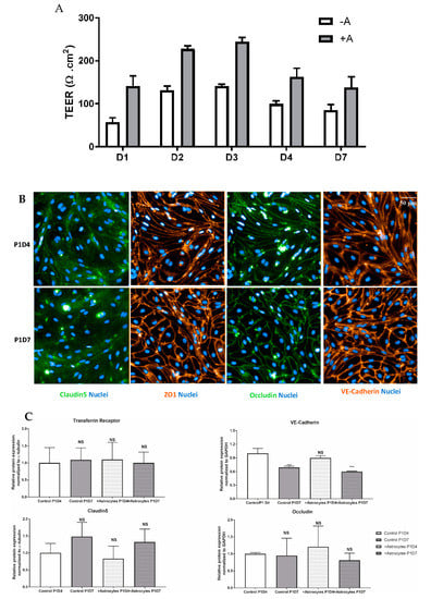 A key BBB feature is the presence of tight junctions between adjacent endothelial cells [95], where claudins (CLDN family), occludin (OCLN), and junctional adhesion molecules (JAMs) interact with cytoplasmic adaptors, including zona occludens and cingulin (CGNL1), establishing a linkage to the cytoskeleton and adherens junctions. In BECs, CLDN5 has shown to be the dominant CLDN family member and critical for the barrier formation and function [96,97]. The transcriptomic analysis hereby presented evidences CLDN5 as the highest expressed tight junction element within the cynomolgus brain vasculature, and likewise maintaining considerable high levels in vitro. A substantial expression following sub-culturing in vitro is also seen for other tight junctions, such as TJP1, OCLN, JAMs, and cadherins. The confirmation of protein expression of major tight junctions in our NHP-derived BECs, and notably their morphological distribution at the cell-to-cell interaction further hallmarks the tightness of the cell monolayer formed. Such results support that NHP-derived BECs maintain a relevant level of differentiation, representative of the brain microvasculature in its physiological state. The co-culture of BECs with astrocytes resulted in an increase on the average TEER measurements, but not in the global expression of tight junction and transporter proteins, findings corroborated by previous studies [98].