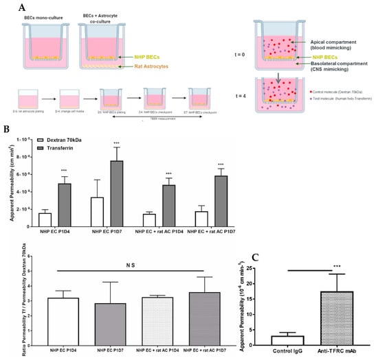 Proof of concept of the use of the present NHP-derived BBB model for evaluation of the apical to basolateral passage of selected molecules. (A) Schematic representation of the set-up of NHP-derived BBB model. NHP-derived BECs at P1 are plated on the insert, and rat astrocytes are optionally plated at the bottom of the well. Plating of rat primary astrocytes is performed 6 days before BECs are plated onto collagen and fibronectin-coated membrane filter inserts. This model is used at P1 following either 4 or 7 days in vitro. At the beginning of the assay, test molecules (human holo-transferrin and dextran 70 kDa) were incubated apically for 4 h at 37 °C. After 4 h, media from the apical and basolateral chambers were collected to assess paracellular flux (dextran 70 kDa) or transcytosis (transferrin). Such molecules present in the media from the apical and basolateral chambers were quantified by fluorescence or by IgG ELISA. (B) Permeability (10−6 cm min−1) from apical to basolateral passage of human holo-Transferrin (Tf) versus Dextran 70 kDa measured in the NHP BBB model. This model was used at P1 following either 4 or 7 days in vitro (P1D4 and P1D7, respectively) in the absence or presence of primary rat astrocytes (control and + rat AC, respectively). Results are expressed as mean ± S.D. (n = 3 independent experiments, performed in triplicate or quadruplicate). p-values were obtained by Two-way ANOVA with Sidak’s multiple comparisons test or One-way ANOVA with Dunnett’s multiple comparison test vs. NHP EC P1D4 group. NS: no statistical significance = p > 0.05, *** = p < 0.001. (C) Permeability (10−6 cm min−1) from apical to basolateral passage of an anti-TFRC antibody versus a control mouse IgG measured in the NHP BBB model. This model was used at P1 following either 4 days in vitro in the presence of primary rat astrocytes. Results are expressed as mean ± S.D. (n = 3 independent experiments, performed in quadruplicate). p-values were obtained by Student t-test NS: no statistical significance = p > 0.05, *** = p < 0.001.