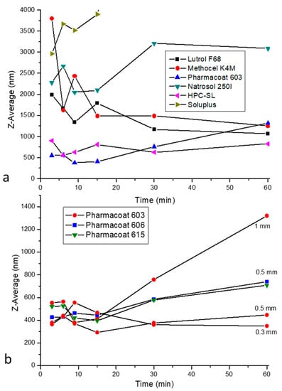 The results of the mean hydrodynamic diameter, i.e., Z-average size over time, are shown in Figure 1. Evidently, the two most suitable stabilizers further investigated are the low viscosity cellulosic polymers, Pharmacoat 603 and HPC-SL. After an initial steep drop of the particle size at around 10 min of milling time, the Z-average size changes by a lower rate and after 60 min of processing it becomes 603 nm in the presence of Pharmacoat, and 828 nm in the presence of HPC-SL. Therefore, Pharmacoat 603 was selected as the stabilizing agent of choice. This finding is also in line with bibliographic data [43], suggesting that cellulose-type polymers are proven to be suitable for the stabilization of nano-suspensions. In the cases of Soluplus and PVP K12, size measurements by dynamic light scattering after 30 and 60 min did not produce credible results, probably due to extensive API dissolution.