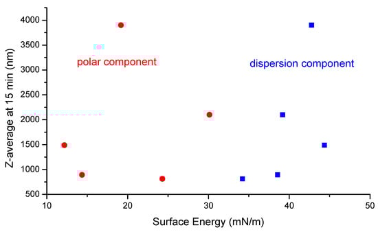 Contact angles formed between the surface of IBU and stabilizer solutions was measured at 60.2°, 55.7°, and 54.1° for HPC-SL, Pharmacoat 603, and Methocel K4M, respectively. Lower contact angle, and therefore improved wettability, corresponds to higher particle size and lower stabilization efficiency. This effect, however, is confounded with the effect of solution viscosity, since HPMC K4M solutions are more viscous than the corresponding solutions of HPC-SL and Pharmacoat 603 at the same concentration. Therefore, we considered this result to be inconclusive and attempted to correlate the stabilizer efficiency when reducing the particle size (referring to the Z-average size achieved after 15 min of milling), to the polar and dispersion surface energy components, as demonstrated by Table 2, while the results are exhibited by Figure 2. The dispersion component weighed contribution appears dominant at territories of high surface energy values.