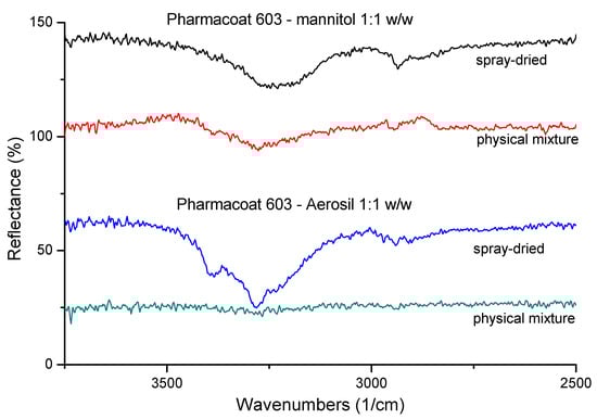 ATR–FTIR spectra of dried mixtures of the selected Pharmacoat 603, with Mannitol and Aerosil, were employed to investigate possible intermolecular interactions (Figure 2). Mixtures with mannitol, independent of the concentration, showed significant differences before and after SD, and in particular a shift of peaks at 3350 and 3000 cm−1, attributed to vibrations of the C-H groups and of O-H bonds, respectively. On the contrary, mixtures with Aerosil produced spectra free of peak shifts or any other noticeable changes except for a peak intensity increase, which is probably a result of Mannitol recrystallization upon drying. These findings indicate the absence of molecular interactions induced by the SD process. Mannitol was selected as a suitable diluent, as it was deemed likelier to interact with Pharmacoat-603, due to the high reflectance levels illustrated in Figure 3.
