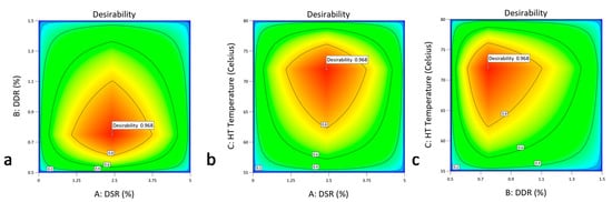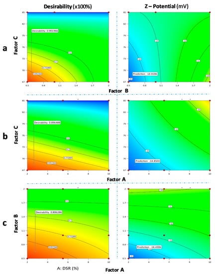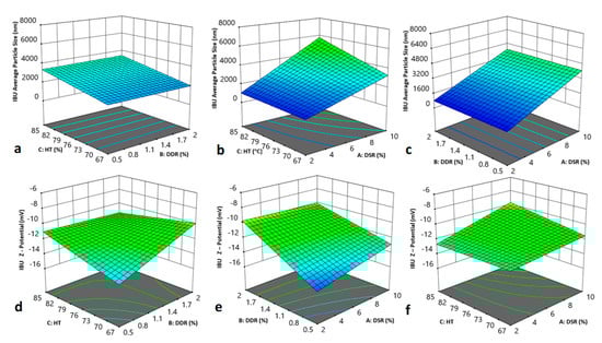 The effects of the formulation factors and process parameters considered in the DoE, on the average particle size of the redispersed IBU suspensions, were statistically analyzed and their numeric results are presented in Table 6 and graphically by the three-dimensional orthogonal plots in Figure 4a–c.