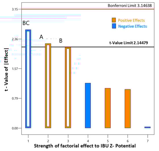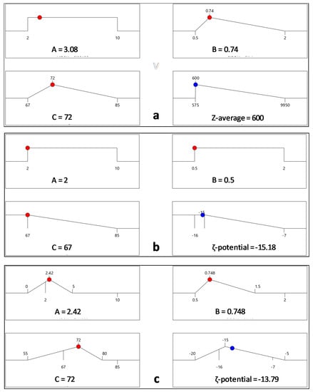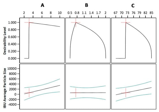 Regarding the IBU Z-average particle size the standard least squares method of multiple linear regression was fitted to model the data. The effect of CPPs and the probability value (p-value) on the average particle diameter and on Z-potential were evaluated. ANOVA was implemented to assume a further cause–effect relationship; this infers that the factors sort the given data points into one of the groups causing the mean value difference. In addition, three-dimensional surface plots were constructed to visualize the CQA responses in relation to the two-factor interactions, while numerical optimization was employed to explore the design space in order to define the desirable operational space.