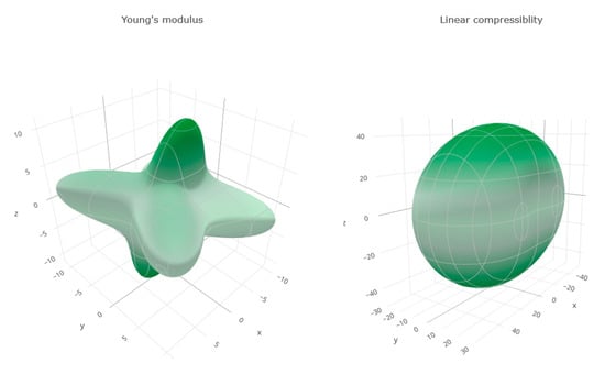 where R and V denote the calculation of the corresponding modulus following the Reuss or Voigt formula, respectively. The spatial dependence of the Young modulus, as well as of the compressibility, were visualized using the ELATE tool for analysis of elastic tensors [33], available online at http://progs.coudert.name/elate.