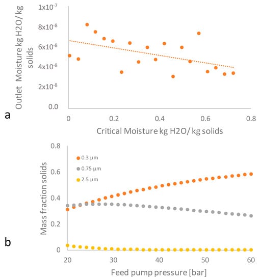 Sensitivity analysis at constant temperature of 52 °C: (a) of dependence of critical moisture to outlet product IBU moisture content demonstrating SD efficiency, and (b) of feed pump pressure dependence on the mass fraction IBU solid.