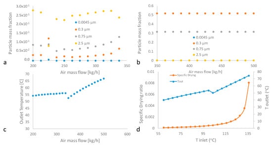 Sensitivity analysis of: (a,b) particle mass fraction dependence on different ranges of air mass flow, (c) outlet temperature dependence on air mass flow and (d) specific drying ratio dependence on inlet temperature.