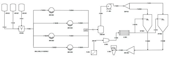 Having completed the DoE, the QbD study and modelling of the ball mill and spray drying, the final process flow diagram according to ISO 10628-1 that connects all the process unit blocks and the auxiliaries is presented in Figure 17. The manufacturing capacity of IBU nanocrystals is predicted to cover a pilot production of 12 tons of formulated API, in 301 days operating at a single 8 h shift, suggesting that further scale-up of IBU nanocrystal is feasible. Each ball mill complex process unit is represented by the rectangular stripped shape that incorporates the BM-001 to BM-004 bowls, and hence is multiplied by 10 to meet the required production capacity.