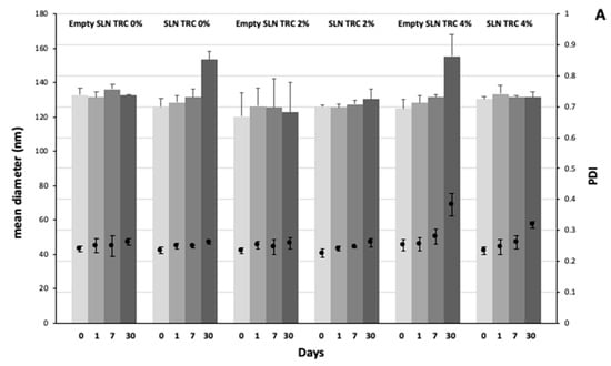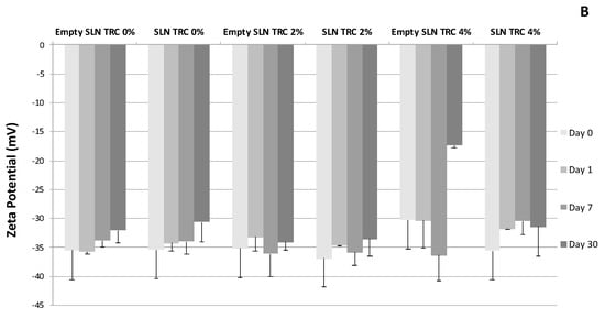 As shown in Figure 2A, SLNs’ mean diameter and polydispersity index values remained constant over the studied period. Only for formulation SLN TRC 0%, and empty SLN TRC 4%, a moderate growth of the mean diameter (approximately +20% with respect of the freshly prepared formulations) was reported at day 30.