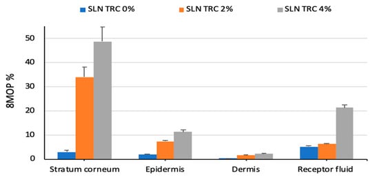 Finally, the % of 8-MOP accumulated in the different skin layers (stratum corneum, epidermis, and dermis) and permeation through the whole skin after application of SLN with or without TRC is reported in Figure 4. In accordance with the results obtained with other lipidic nanocarriers [9], all the SLNs that we developed showed higher drug accumulation in the stratum corneum as compared to viable epidermis and dermis, since these strata have higher hydrophilic characteristics than thee stratum corneum. Therefore, lipophilic substances, such as 8-MOP, tend to accumulate in this tissue. It is worth noticing that after SLN TRC 2% and TRC 4% application, the % of the drug accumulated in each skin layer was significantly greater than that found after SLN TRC 0% application. The ability of different lipidic nanocarriers to enhance 8-MOP skin delivery has been previously reported in the literature [6,7,8,9,10,11,14,25,26,27,28]. For instance, in our group’s previous study, we incorporated 8-MOP into vesicular carriers (liposomes and niosomes) positively or negatively charged and we investigated their effect on 8-MOP diffusion through the skin and on its distribution within the skin layers. In comparison to the drug hydroalcoholic solution, all the vesicular carriers increased both the skin’s permeation and accumulation [7]. The results obtained in this work with Transcutol SLNs revealed up to around a three-fold higher skin accumulation as compared by the data obtained with vesicles.