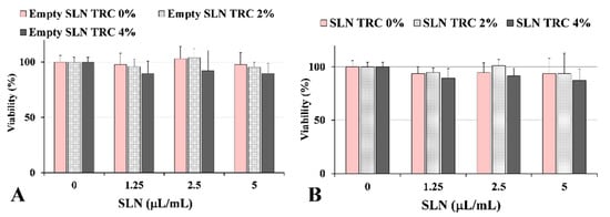 Viability (expressed as % of the control) (MTT assay) measured in control 3T3 fibroblasts (0) and cells treated for 24 h with three aliquots (1.25, 2.5, 5 µL/mL) of unloaded SLNs (empty SLN) (A) and 8-MOP-loaded SLNs (SLN) (B) with different % of TRC (0%, 2%, 4%). Data are expressed as a mean ± standard deviation (SD) of three independent experiments involving triplicate analyses for each sample (n = 9).