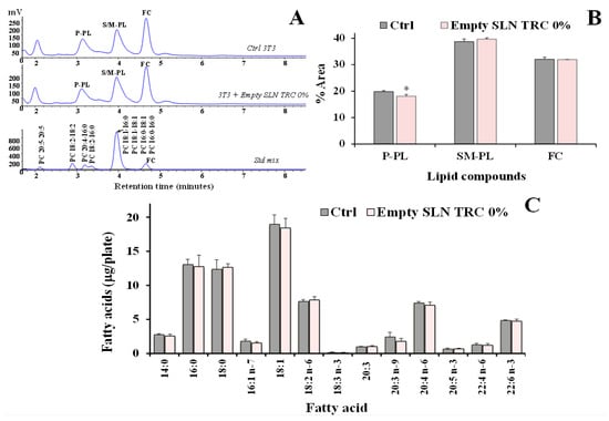 (A) Chromatographic profile, obtained by HPLC-ELSD analysis, of lipid compounds (saturated/monounsaturated phospholipids, S/M–PL; polyunsaturated phospholipids, P-PL; free cholesterol, FC) measured in control 3T3 fibroblasts (Ctrl) and cells treated for 24 h with unloaded SLN without TRC (empty SLN TRC 0%) (A); the chromatographic region for each lipid class was assigned by using standard mixtures of saturated/monounsaturated (mix PL: PC 16:0/16:0, PC 18:1/18:1, PC 16:0/18:1, PC 18:1/16:0, ECN 32) and polyunsaturated phosphatidylcholines (PC 16:0/18:2, ECN 30, PC 16:0/20:4, PC 18:2/18:2, ECN 28, PC 20:5/20:5, ECN 20). Values of PL and FC (% area) (B) and the main fatty acids (expressed as µg/plate) (C) measured in control 3T3 and fibroblasts treated with empty SLN TRC 0% (24 h). Two independent experiments and tree replicates for each condition are performed and data are presented as mean ± SD (n = 6); * = p < 0.05 versus respective Ctrl (Student’s unpaired t test with Welch’s correction).