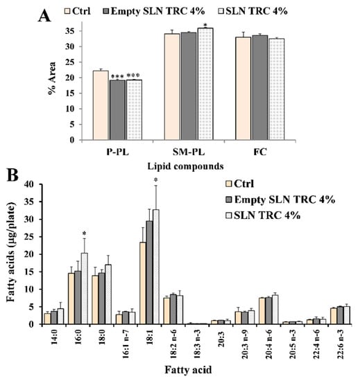 Figure 7 shows the values of polar lipid compounds (S/M–PL, P-PL, FC) (% area) (Figure 7A) and main fatty acids (µg/plate) (Figure 7B) measured in 3T3 fibroblasts treated for 24 h with empty and 8-MOP-loaded SLNs with 4% of TRC (empty SLN TRC 4% and SLN TRC 4%) compared to the respective control cells. Both formulations (at the dose of 5 µL/mL) induced in 3T3 cells a change in the profile of polar lipids, in particular a marked (p < 0.001 versus untreated cells) decrease was observed in the % of peak corresponding to P-PL with respect to the other peaks, coupled to an increase in the % of S/M-PL (Figure 7A), with the latter effect more marked in cells treated with SLN TRC 4%. The 24 h treatment of fibroblasts with both formulations also affected the cell fatty acid profile. A remarkable increase in the cell levels of 18:1 n − 9 (p < 0.05 versus untreated cells), 16:0 (p < 0.05), and 18:0 was detected in fibroblasts incubated with SLN TRC 4%, while the treatment did not seem to affect the levels of the other unsaturated fatty acids, with respect to control cells. The fatty acid profile modulation was less marked in 3T3 cells treated with empty SLN TRC 4%, with an evident, but not significant, increase of 18:1 n − 9.