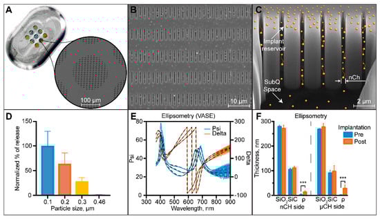 Further, we assessed the thickness of the membrane layer and the surface roughness, before and after device implantation (Figure 1E,F). Ellipsometry measurement confirmed an average thickness of 275 nm for SiO2 and 100 nm for SiC. Both SiO2 and SiC showed no difference in thickness before and after implantation, confirming the inertness of the SiC outmost layer. SiC was purposely chosen as a membrane encapsulation layer because it offers biocompatibility and chemical inertness [40,41,42,43,44,45,46,47]. We previously demonstrated in vitro its ability to withstand a simulated physiological environment even at accelerated condition (77 °C) for up to 4 months [23]. Conversely, membrane surface roughness showed a significant increase after implantation, which can reasonably be associated with cellular debris or surface protein adsorption. Although protein adsorption on LA drug delivery systems is generally considered nonideal, we have extensively showed that the membrane function and drug release rates are not negatively affected by this process [18,48].