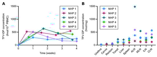 Tenofovir-diphosphate (TFV-DP) peripheral blood mononuclear cells (PBMC) and tissue distribution of TAF from subcutaneous nTAFt. nTAFt implants (n = 5) were retrieved after 1 month. (A) Intracellular TFV-DP PBMC concentrations of nTAFt. (B) Tissue TFV-DP concentrations upon euthanasia after 1 month of implantation. NHP, nonhuman primate, ALN, axillary lymph nodes, MLN, mesenteric lymph nodes, ILN, inguinal lymph nodes, CLN, cervical lymph nodes.
