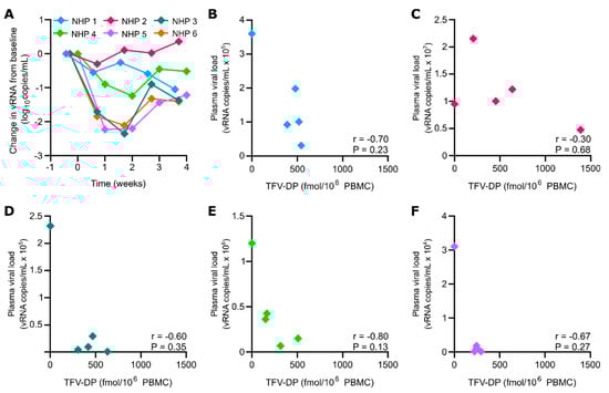 Viral load reduction and correlation with TFV-DP PBMC concentration. (A) Viral load reduction from baseline of nTAFt (n = 6). Change in SHIV RNA from baseline (log10 copies/mL) at week 1, 2, 3 and 4 throughout continuous subcutaneous TAF dosing. Data are presented for each individual NHP. (B) NHP 1 TFV-DP PBMC concentration correlation with plasma viral load. (C) NHP 2 TFV-DP PBMC concentration correlation with plasma viral load. (D) NHP 3 TFV-DP PBMC concentration correlation with plasma viral load. (E) NHP 4 TFV-DP PBMC concentration correlation with plasma viral load. (F) NHP 5 TFV-DP PBMC concentration correlation with plasma viral load. Statistical analysis on panels (B–F) performed by Spearman correlation.