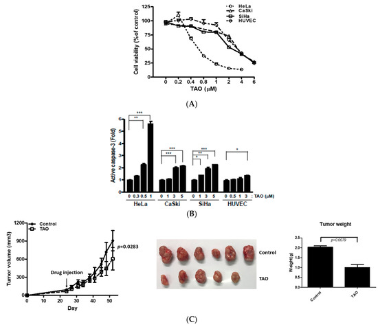 In order to see the effects of TAO on cell viability, an MTT assay was performed in cervical cancer cell lines, including SiHa, HeLa, CaSki, and HUVECs. In all three cervical cancer cell lines and HUVECs, cell viability decreased as the concentration of TAO increased (Figure 1A). The IC50 of TAO on SiHa, CaSki, and HUVEC at 72 h was 3 µM, and the IC50 of HeLa was 0.6 µM (Table 1). The levels of active caspase-3 were also measured with Western blot. It was shown that active caspase-3 increased as the concentration of TAO increased, suggesting an increase of cellular apoptosis in all three cancer cell lines and HUVECs (Figure 1B). Mice bearing SiHa cell tumors were treated with TAO, which was injected intraperitoneally at 8 mg/kg body weight per injection, once a week. Calculated tumor volume was significantly smaller in animal models that were injected with TAO in comparison to those injected 0.9% sodium chloride control solution (Figure 1C).