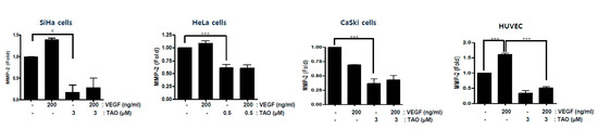 The concentrations of MMP-2 by enzyme-linked immunosorbent assay (ELISA). The treatment of TAO significantly decreased the concentrations of MMP-2 in all cervical cancer cell lines and HUVECs. The co-administration of vascular endothelial growth factor (VEGF) and TAO did not change the inhibitory effects of TAO on MMP-2, whereas the treatment of VEGF only mildly increased the concentrations of MMP-2 in SiHa and HeLa cell lines and HUVECs. * p-value < 0.05, *** p-value < 0.001.
