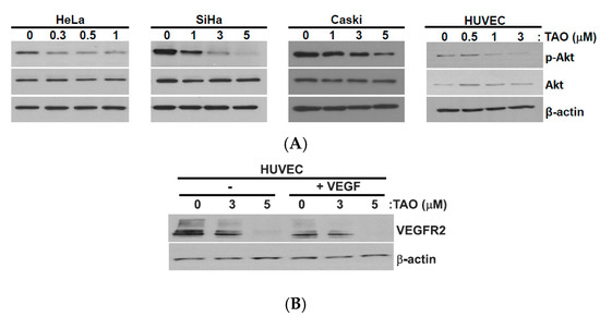 Cells were plated with 200,000 cells/well on a 6-well plate. The cells were treated with TAO at concentrations indicated in the text for 48 h. Cellular protein was lysed by incubating for 20 min on ice in radioimmunoprecipitation assay (RIPA) buffer containing 1X protease inhibitor mix (P-8340, Sigma-Aldrich, St. Louis, MO, USA) and 1 mmol/L of phenylmethylsulfonyl fluoride (PMSF, P-7626, Sigma-Aldrich, St. Louis, MO, USA). Protein concentrations were determined using the Bio-Rad protein assay (Bio-Rad Laboratories, Hercules, CA, USA), and proteins were separated by sodium dodecyl sulfate-polyacrylamide gel electrophoresis (SDS-PAGE), then were electrotransferred to a polyvinylidene difluoride (PVDF) membrane. After blocking membranes with 5% non-fat dry milk in PBS, membranes were incubated with primary antibodies overnight at 4 °C. After several washes, blots were incubated with secondary antibodies (GeneTex, Irvine, CA, USA) for 1 h. After an additional wash, light development was initiated by adding enhanced chemiluminescence (ECL) reagents (Amersham PLC, Buckinghamshire, United Kingdom). Primary antibodies for studying phosphorylated Akt (Ser473, #9271), Akt (#9272), and VEGFR2 (#2479) were obtained from Cell Signal Technology (Danvers, MA, USA), and β-actin (sc-47778) was obtained from Santa Cruz Biotechnology (Dallas, TX, USA). Phosphorylated-vascular endothelial growth factor receptor 2 (VEGFR2, ab5473) and p62 (ab56416) were obtained from Abcam (Cambridge, UK), and anti-LC3 antibody (NB100-2220) was purchased from Novus Biologicals (Centennial, CO, USA).