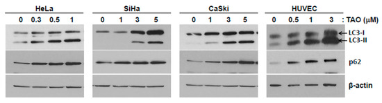To determine if TAO was involved in the autophagy pathway, p62, an intermediate of autophagy, and LC3, an autophagy marker protein, were analyzed by Western blot (Figure 4). It was shown that p62 increased with the treatment of TAO in all three cervical cancer cell lines. This implies that autophagy was reduced in the cell lines by TAO. The treatment of TAO also increased the concentrations of p62 in HUVECs. Conversion of LC3-I to LC3-II, a phosphatidylethanolamine-conjugated form of LC3-I, is a marker for autophagy activation. When autophagy is inhibited, LC3-II cannot be degraded by autolysosome and thereby accumulates in the cytoplasm. In cervical cancer cell lines and HUVECs, the accumulation of LC3-II was observed as the concentration of TAO increased, suggesting its inhibitory effects on autophagy.