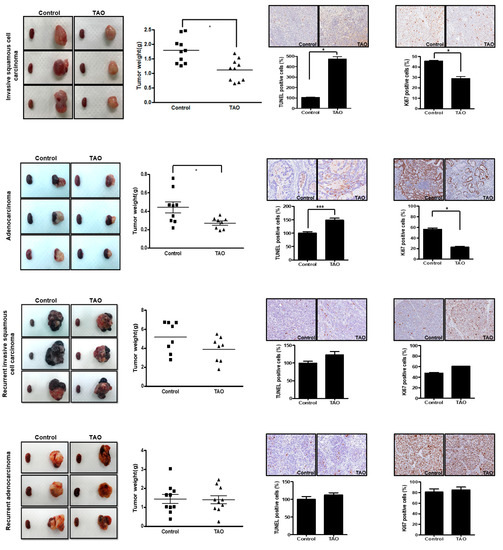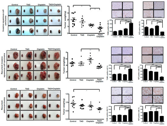 In order to investigate the potential synergistic effects of TAO in addition to conventional cytotoxic agent cisplatin, mouse models were assigned to one of the four groups: control, cisplatin alone, TAO alone, or cisplatin plus TAO. When mouse models with primary invasive squamous cell carcinoma were evaluated, the mean tumor weight of the mouse models that were given cisplatin plus TAO was significantly less than the other three groups (0.94 ± 0.56 vs. 1.84 ± 0.95 vs. 1.30 ± 0.38 vs. 1.61 ± 0.60 g in cisplatin plus TAO, control, cisplatin alone, and TAO alone groups, respectively, p = 0.0315). The same patterns of the synergistic anti-cancer effects of TAO with cisplatin were observed in the mouse models generated from recurrent squamous cell carcinoma and recurrent adenocarcinoma (Figure 6). The TUNEL assay and Ki-67 assay were also performed. The synergistic effects of TAO with cisplatin were observed not only in primary cancer models but also in recurrent cancer models.