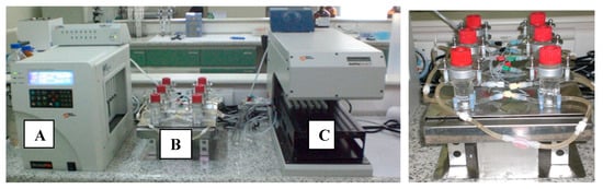 Franz cells apparatus (Microette™, Hanson Research) mounted with a previously validated PAMPA membrane from Corti et al. [5,16] for simulating gastrointestinal permeation. (A) System control for injection pistons of upper chambers; (B) upper and lower diffusion chambers with temperature and stirring control; (C) automated module for sampling and collection.