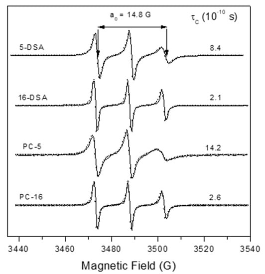 The EPR parameter—isotropic 14N-hyperfine coupling constant, a0—increased with increasing dielectric constant (i.e., solvent polarity) in which the nitroxide radical is dissolved. The measured value of 14.8 G is consistent with a spin label in a membrane [32]. The spin labels 5-DSA and 5-PC with the nitroxide moiety in the region near the polar head group of the bilayer showed more restricted rotational motion relative to their positional isomers 16-DSA and 16-PC, in which the nitroxide radical is more deeply inserted in the hydrophobic core. These results indicate the existence of a gradient of flexibility along the acyl chain, with more restricted motion in the polar region. This pattern is consistent with the properties of lipid bilayers from eukaryotic cells. The rotational motion at the polar interface of the membrane was more restricted for the spin label analog of phosphatidylcholine (5-PC) with τC of 14.2 × 10−10 s than for the stearic acid one (5-DSA) whose τC was of 8.4 × 10−10 s (Figure 2).
