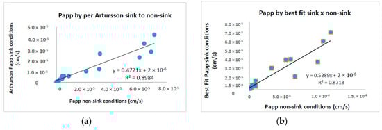Additionally, variability of Papp values was also addressed by the calculation methods. A more sophisticated analysis is done using Artursson’s equation [15] for sink and non-sink conditions as well as checking the impact of extracting a permeability coefficient from data that are not at true steady state and, thus, possibly impacted by dose depletion. Note that for both the sink and the non-sink equation, Papp values showed a particularly good correlation between them (0.8984). Similarly, Papp values obtained by us showed to be very alike to values calculated according to Artursson’s non-sink equation (Table 2, Figure 5). The reason is that we used the same systematic procedure, i.e., the best fit method through the linear portion, to calculate all the slopes characterizing an accurate permeability flow, so that the impact from dose depletion is considered not above average. As a result, all drugs got the same BCS classification in both methods.