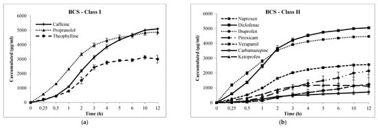 Cumulative transport (µg/mL, h) of drugs across Franz-PAMPA: (a) BCS class I; (b) BCS class II; (c) BCS class III; and (d) BCS class IV. Permeability was calculated from the linear portion (R2). Data are presented as mean ± SD, n = 3